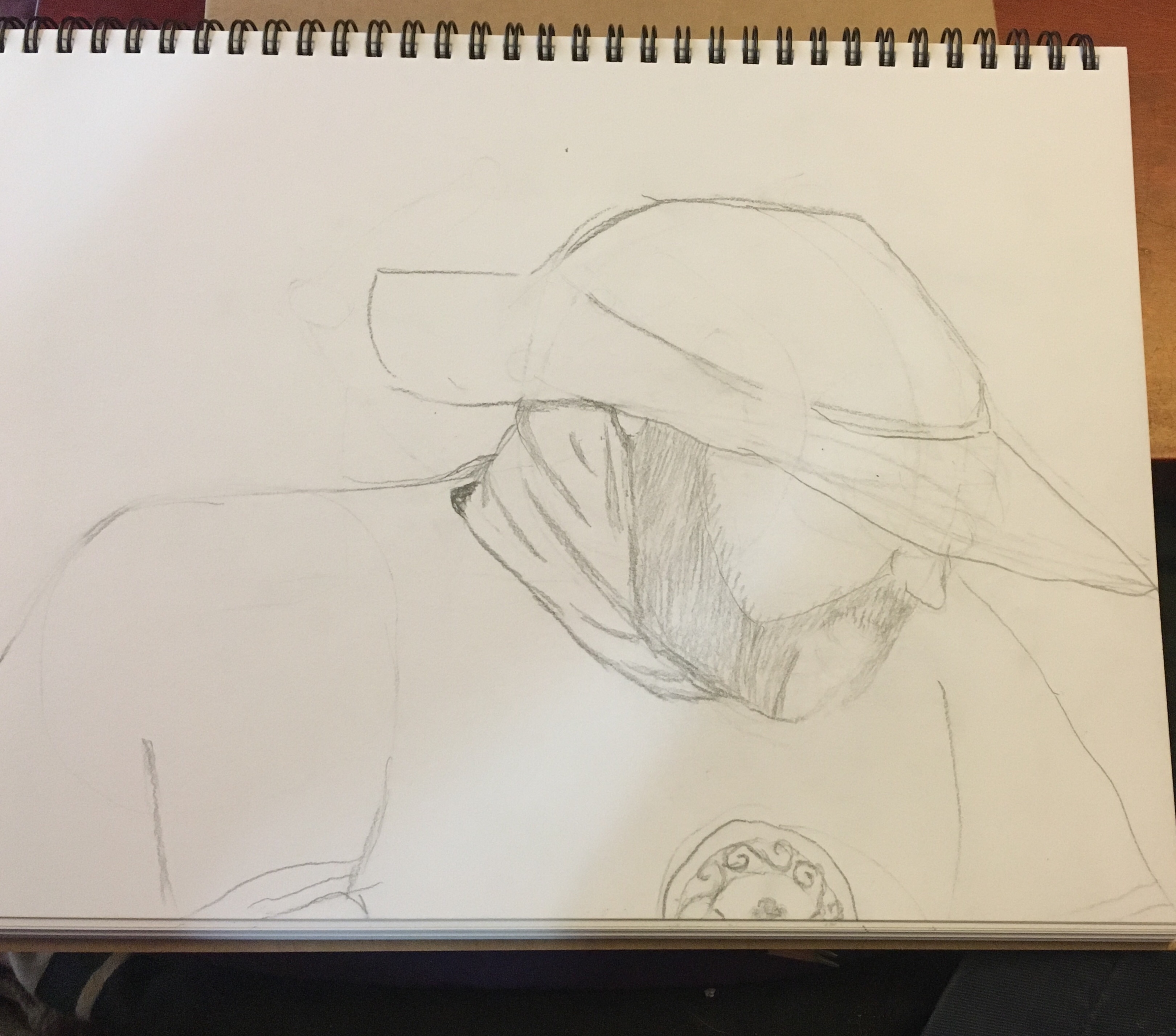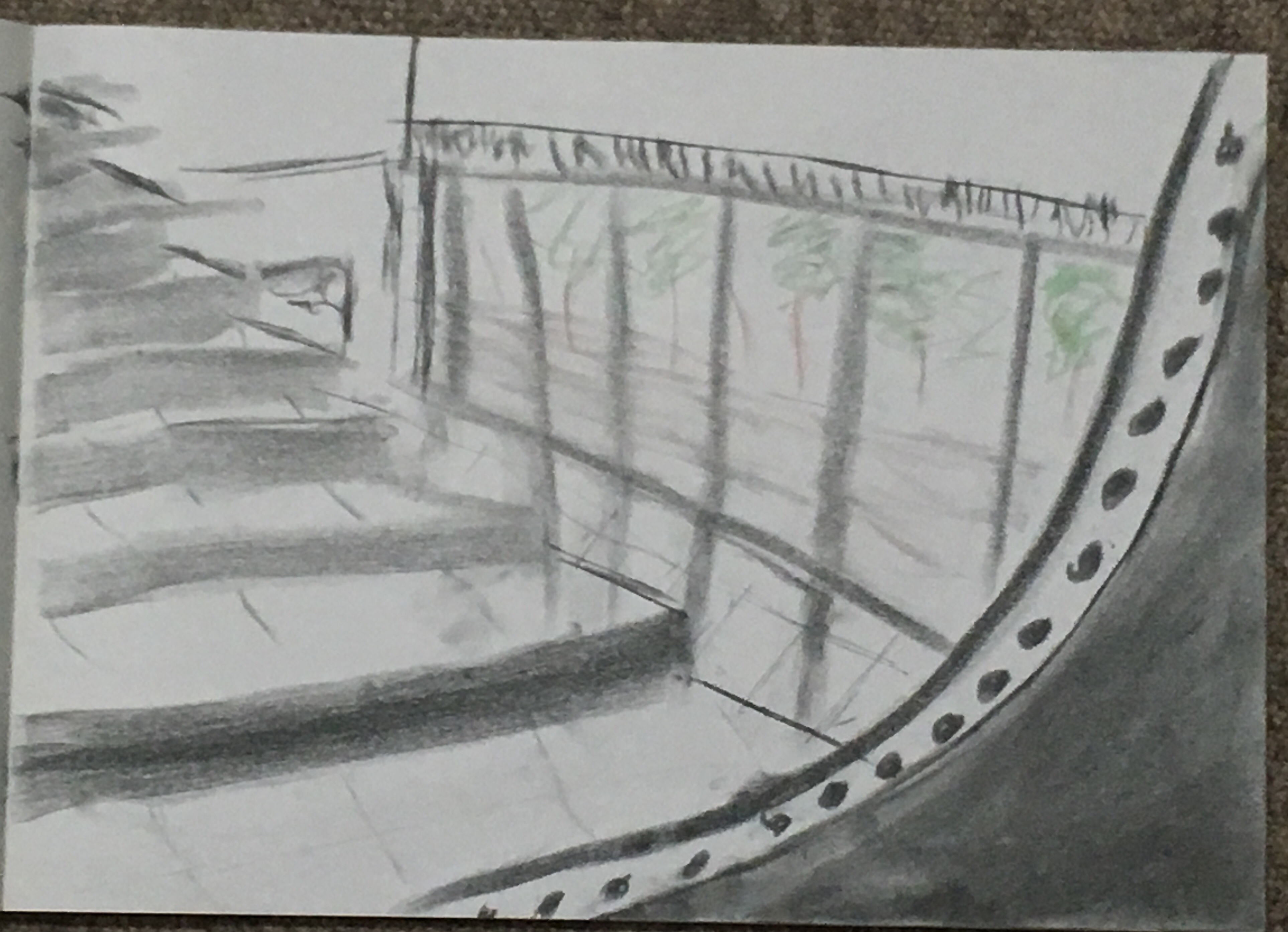 Up to this point I had been nervous about using ink. The thought of making a permanent mark on the page was a bit daunting, which is a bit crazy because I can’t actually see well enough to go back to a point on the page and remove or correct an ‘error’ – I don’t actually believe in ‘errors’, just happy accidents and learning opportunities. I decided to allow myself up to about twenty minutes to draw my response, and go with whatever came into my head first, no matter how difficult I thought it might be, or how unfamiliar I was with the subject.